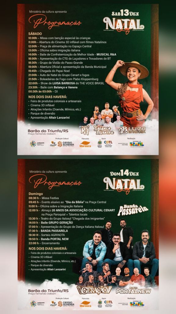 O evento acontece nos dias 13 e 14 de dezembro, na Praça Fernando Dalbem, com uma programação especial preparada com muito carinho para toda a família.